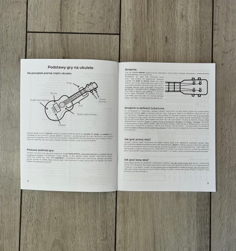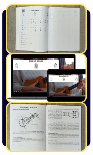 W środku książki znajduje się poradnik : "Jak grać na ukulele" Został napisany w taki sposób, by maksymalnie prosto wytłumaczyć Ci najważniejsze zasady gry. Dzięki niemu zaczniesz grać w ciągu jednego dnia. Dosłownie. Przeprowadzi Cię od zera, do pięknej i prawidłowej gry na ukulele. Znajdziesz w nim wszystko co musisz wiedzieć, opisane w prosty i zwięzły sposób, na 2 stronach. Po to by Twoje skupienie było na grze i zabawie, nie na teorii.