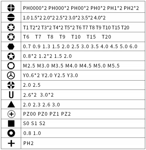- 12 nasadek męskich Phillips/krzyżak (+): PH0000(2szt), PH000(2szt), PH00(2szt), PH0(2szt), PH1(2szt), PH2(2szt)