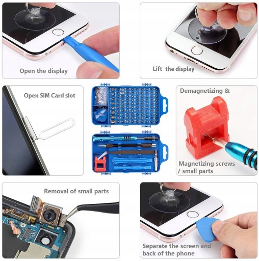 RT0117 to zestaw 110 precyzyjnych narzędzi, bitów i otwieraków z lekkim aluminiowym uchwytem przeznaczony do precyzyjnych napraw serwisowych telefonów i smartfonów w tym produktów marki Apple oraz wszelkiej elektroniki konsumenckiej.