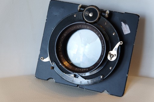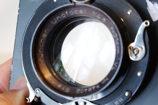 Wewnątrz obiektyw UNOFOCAL 4,5/21 cm firmy STEINHEIL , w bardzo dobrym stanie bez wad .