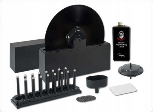 Myjka Wash'n'Play 2 składa się z wanienki z wymiennymi szczotkami z naturalnego włosia, suszarki do płyt, specjalnego lejka do nalewania preparatu czyszczącego, docisku z uszczelkami zabezpieczającymi label oraz adaptera do płyt 7".