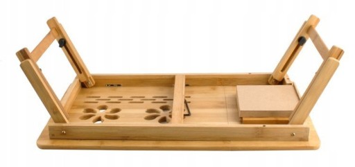 - SPECYFIKACJA – przeznaczony do laptopów o maksymalnej wielkości 17"; materiał: drewno; wymiary stolika (dł/szer/wys): 69/34,6/26,5cm; waga: 2,35kg; regulacja nachylenia: I poziom: 19cm, II poziom: 16cm; III poziom: 12,5cm; IV poziom: 5cm.