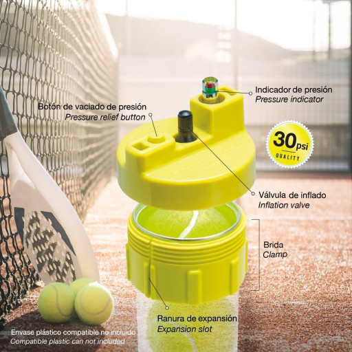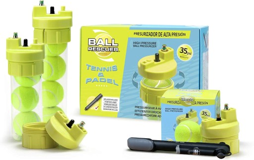 Piłka ratunkowa. Jest to jedyne urządzenie, które pozwala przekształcić pojemnik z trzema lub czterema piłkami tenisowymi lub paddel w łódź ciśnieniową do 30 psi. Opatentowany model i wyprodukowany w Hiszpanii. Zmniejszony rozmiar lekki łatwo przystosowany do pojemników z trzema lub czterema kulkami następujących marek: head dunlop slazenger siux żmija softee patrz konkretne modele poniżej. Każde z kompatybilnych opakowań może być używane przez cały rok i przechowywać inne marki kulek. Nie pasuje do puszek lub opakowań metalowych. Przechowuje trzy lub cztery kulki pod żądanym ciśnieniem i wydłuża ich żywotność do 10 razy. Odzyskaj kule obniżone ciśnienie. Konserwacja uszczelnienia: Uszczelka uszczelniająca została specjalnie zaprojektowana, aby połączyć całkowitą szczelność pojemnika z łatwym otwieraniem. Chociaż jest wstępnie nasmarowany fabrycznie, jeśli wykryje straty ciśnienia, będziesz musiał wyjąć uszczelkę z obudowy i nasmarować ją smarem silikonowym, lub w jego wadze wazeliną ważna, ale mniej zalecana opcja. Odpowiedzialność społeczna przedsiębiorstw: Plan zbierania bezużytecznych piłek kulkowych rescuer: jeśli zebierzesz 250 piłek lub więcej i włożysz je do worka o pojemności 50 litrów, zbieramy je do wysłania do zakładu recyklingu, gdzie dadzą im drugie użycie do produkcji torów sportowych, odzieży lub obuwia. Zanim wyrzucisz piłkę do kosza, pamiętaj, że rozkład zajmie 2 500 lat. Ostrzeżenia dotyczące bezpieczeństwa: brak ciśnienia za pomocą sprężarki. Nie należy podawać ciśnienia bez kulek wewnątrz opakowania. Nie zwiększać ciśnienia powyżej 30 psi, 2 bar, 2 atm lub 2 kg/cm2.