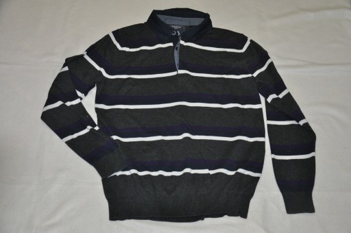 Atlantic Bay - fajny cienki sweter, rozmiar M, granatowy kołnierzyk i zapięcie na 3 guziki (+ zapas), szary w białe, fioletowe i granatowe paski, rękawy i dół zakończone ściągaczami, sweterek jest cienki.