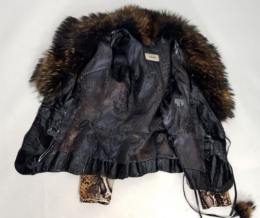 Oferuję do sprzedania ekskluzywne nietuzinkowe futerko renomowanej firmy MODA SHOW ,szyte z cielęcej skóry futerkiem na zewnątrz,futro z króciutkim włosem ściśle przylegającym do skóry,futerko wygląda jak aksamit ,bez zapięcia jedynie wiązanie w talii ,przy szyi olbrzymi kołnierz z przepięknym futerkiem z jenota,cudowny długi włos, wewnątrz podszewka atłasowa ,obrzeża płaszcza wewnątrz i kieszeni obszyte cieniutką skórą naturalną lakierowaną , idealne na wiosnę lekką zimę i jesień,przepiękny wzór wężowej skóry .Fason zgrabny taliowany,dopracowane w najmniejszym detalu.