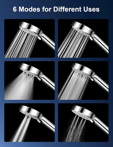 - ➡️Głowica prysznicowa z 6 trybami: Ta wydajna głowica prysznicowa ma sześć różnych trybów. Każdy tryb został stworzony, aby poprawić wrażenia z prysznica, zapewnić wspaniałe wrażenia z prysznica w łazience.