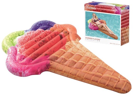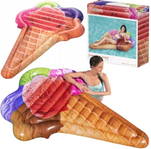 Nadmuchiwany materac do pływania w kształcie loda w rożku od BESTWAY Grafika, która znajduje się na jego zewnętrznej powierzchni, odwzorowuje prawdziwego loda z wafelkiem i kolorowymi gałkami w różnych smakach Miejsce na głowę posiada specjalne wyżłobienia tworzące poduszki Zwiększają one komfort podczas pływania Ciekawy design produktu przyciąga uwagę nie tylko dzieci, ale również dorosłych.Wymiary opakowania: 24x24x6cmMaksymalne obciążenie: 90 kg