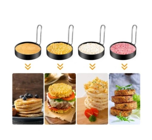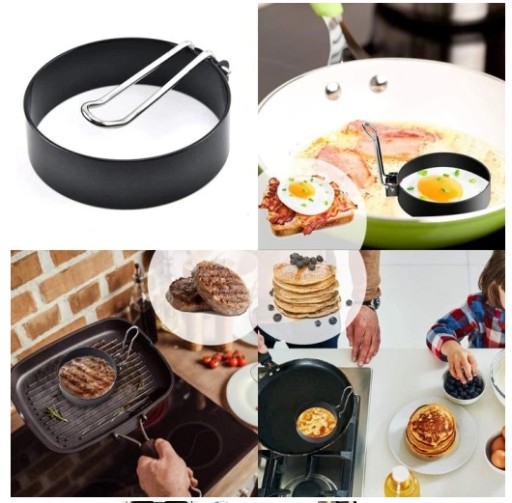- Egg Ring może dostosować hamburgery, pieczywo, owoce, galaretki, jajka, omlety, herbatniki, naleśniki, bekon, ziemniaki,