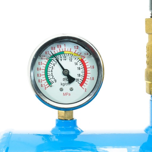 Ważnym elementem urządzenia jest zawór bezpieczeństwa kontrolujący ciśnienie w zbiorniku. Natomiast jasny i czytelny manometr wskaże aktualne ciśnienie pompowanego powietrza.