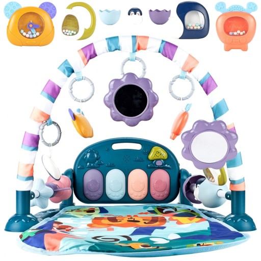 - ➡️ Mata ma przymocowany pałąk z kolorowymi zabawkami-grzechotkami, leżąc dziecko może stópkami grać na pianinie.