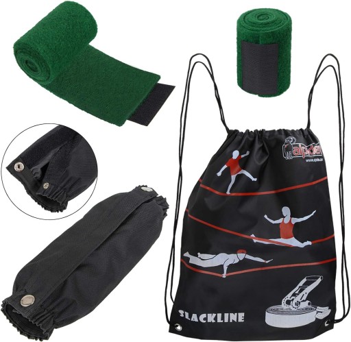 Zestaw zawiera wszystko, co potrzebne do łatwego i bezpiecznego zamocowania slackline na drzewach. W komplecie znajdują się osłony na drzewa, które chronią korę i zapewniają stabilność liny, oraz napinacz grzechotki, który umożliwia szybkie i łatwe napięcie liny.