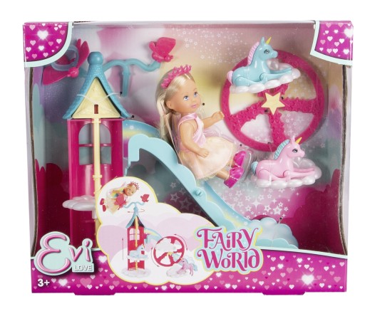 Przeżyj magiczne chwile z zestawem Evi Love Fairy. Wróżka Evi Love i jej 2 jednorożce przekształcają pokój każdego dziecka w magiczne miejsce. Ze swoimi kolorowymi wróżkowymi skrzydłami i piękną błyszczącą sukienką w pastelowych kolorach, Evi Love wygląda magicznie jak wróżka. Razem ze swoimi małymi jednorożcami Evi Love może przeżyć magiczne chwile jako wróżka na dołączonej wieży do zabawy. Zjeżdżalnia, winda napędzana korbą, a przede wszystkim magiczny diabelski młyn chmurka, na którym zmieszczą się oba jednorożce, gwarantują magiczną zabawę. Ciii! W wieży zabaw znajduje się schowek na magiczną różdżkę Evi Love! Lalka o wysokości 12 cm w uroczym stroju wróżki jest słodkim towarzyszem zabaw.