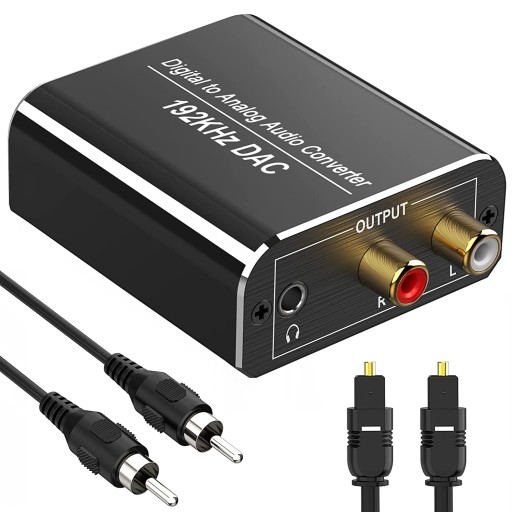 - Konwerter audio DAC konwertuje sygnał cyfrowy (Toslink/koncentryczny) na sygnał analogowy (RCA L/R lub gniazdo 3,5 mm). Zasilany kablem zasilającym o mocy 0,5W (5V, 1A) z portu USB.