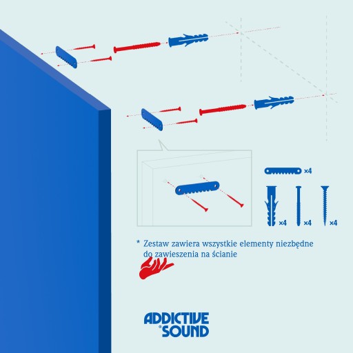 - Produkt dostępny jest w szerokiej gamie kolorów, pasujących do różnorodnych wnętrz. Logo Addictive Sound znajduje się na każdym panelu.