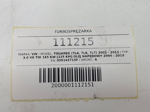 Przedmiot aukcji: TURBOSPRĘŻARKA 059145715F VW TOUAREG 7L I 3.0 TDI 225 KM