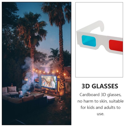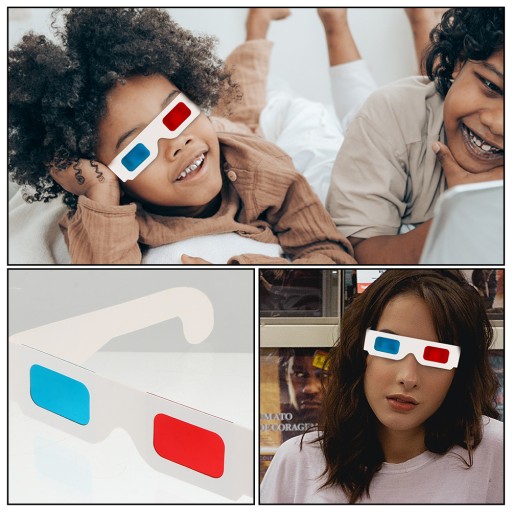 ✅Białe kartonowe ramki z czerwonymi i niebieskimi okularami, niedrogie rozwiązanie Twoich potrzeb anaglifowych.