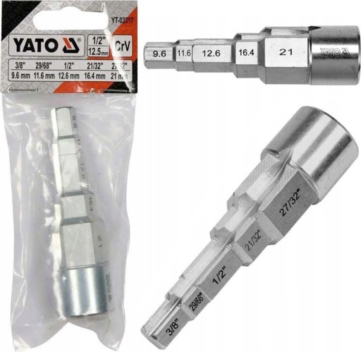 Klucz stopniowy o uniwersalnych rozmiarach 3/8" (9,6 mm) / 29/68" (11,6 mm) / 1/2" (12,6 mm) / 21/32" (16,4 mm) / 27/32" (21 mm) z napędem 1/2" wykonany z wysokogatunkowej stali CRV.