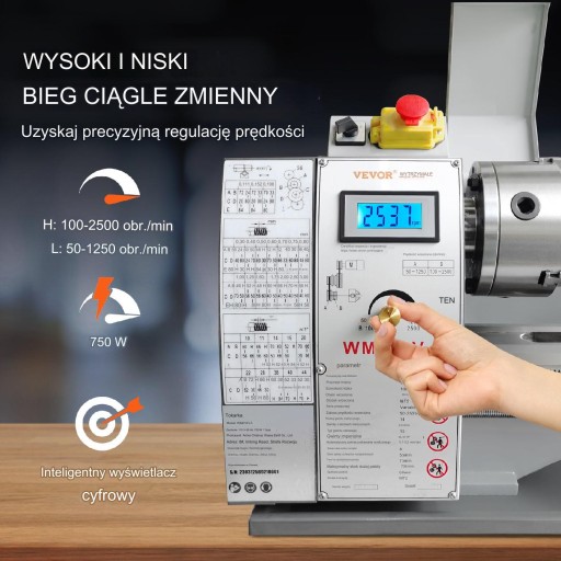 Posiada wrzeciono, które może obracać się zarówno do przodu, jak i do tyłu, z dwiema opcjami prędkości: wysoki bieg 100-2500 obr / min i niski bieg 50-1250 obr / min. Posiada również inteligentne elektryczne sterowanie prędkością i cyfrowy wyświetlacz, co pozwala na dokładną regulację prędkości i ułatwia pracę.
