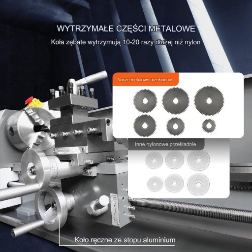 Nasze tokarki elektryczne do metalu są zbudowane z wysokiej jakości żeliwa HT200. Są one wyposażone w odporne na zużycie i wytrzymałe metalowe koła zębate oraz koła ręczne ze stopu aluminium, co zapewnia dłuższą żywotność.