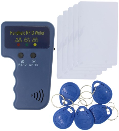 Programator do breloków i kart RFID o częstotliwości 125kHz. Jest kompatybilny z chipami T5577 oraz EM4305. Do zasilania wymaga zastosowania 2 baterii AAA (brak w zestawie). W zestawie znajduje się 5 breloków oraz 5 kart RFID, wszystkie programowalne. Urządzenia jest łatwe w obsłudze, wystarczy posiadać brelok do skopiowania oraz pusty brelok do zaprogramowania. Należy przyłożyć pierwszy z nich i wcisnąć przycisk READ, następnie pusty i wcisnąć WRITE. Urządzenie jest idealne dla serwisów kluczy, serwisów domofonów jako tańszy zamiennik.