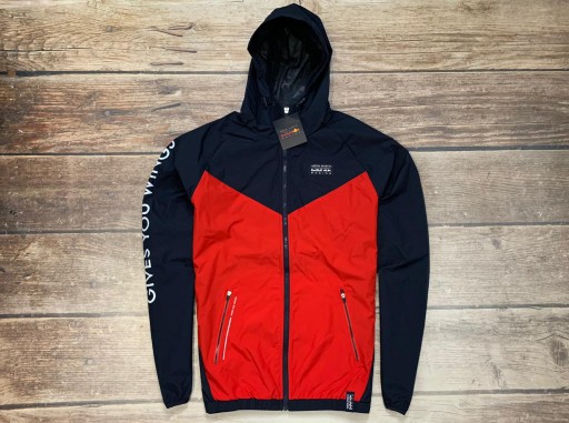 Duże logo Red Bull umieszczone na dole kurtki.