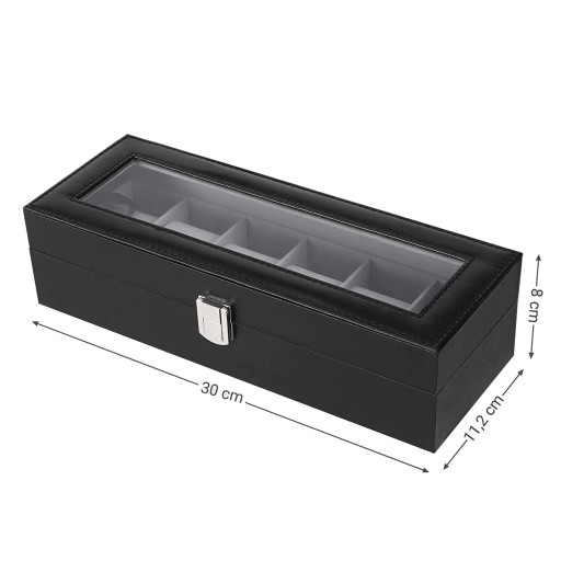 Przedstawiamy pudełko na zegarki warte każdej złotówki dzięki wyjątkowej jakości i wykwintnemu rzemiosłu To idealna propozycja dla kolekcjonerów zegarków, którzy cenią sobie elegancki wygląd swoich czasomierzy Przeszycia, czarna powierzchnia pudełka i błyszczący metalowy zatrzask sprawiają, że każda kolekcja zegarków prezentuje się jeszcze bardziej elegancko Pudełko na zegarki z przezroczystym szklanym wiekiem pozwoli Ci szybko odnaleźć odpowiedni zegarek do swojej stylizacji Dzięki aksamitnej wyściółce i poduszkom, Twoje zegarki są dobrze chronione przed kurzem, zadrapaniami i wstrząsami Pudełko oferuje 6 przegródek, aby pomieścić wiele zegarków w jednym miejscu Ta szkatułka jest idealnym prezentem dla miłośników zegarków, dodając nowoczesnego akcentu do każdego pomieszczenia