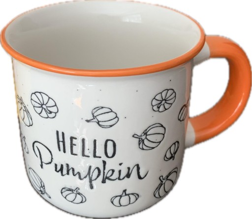 Ceramiczny kubek z motywem jesiennym, w jesiennych barwach - dynie. Wzór dookoła kubka.
