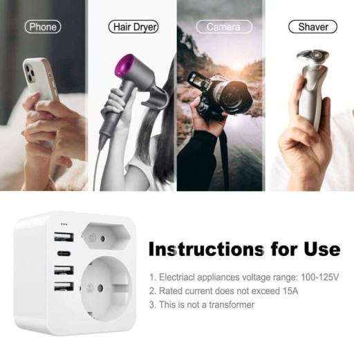 - Ten produkt nie jest konwerterem napięcia: ten produkt jest odpowiedni dla podwójnego napięcia lub napięcia w zakresie 100V-250V, bez funkcji konwersji napięcia, należy wcześniej sprawdzić, czy moc znamionowa urządzenia elektrycznego mieści się w zakresie użytkowania, jeśli tak nie jest w normalnym zakresie napięcia kraju podróży, należy użyć z transformatorem.