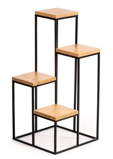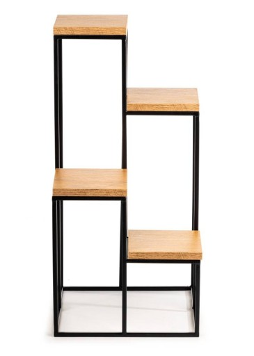 Nowoczesny kwietnik stojący w stylu loftowym Dzięki swojej prostocie i unikalnemu designowi stojak będzie idealny jako uzupełnienie do każdego stylu mieszkania, pokoju czy domu Dzięki solidnemu i wytrzymałemu wykonaniu sprawdzi się również na: balkon, ogród, altanę czy werandę Stojak wykonany jest z drutu stalowego oraz z solidnej płyty MDF w kolorze dąb lancelot Kwietnik jest trwały, lekki i stabilny dzięki czemu ma uniwersalne zastosowanie w domu czy ogrodzie Kwietnik ma cztery poziomy wysokości : 70 cm, 52 cm, 36 cm oraz 21 cm Prezentowany kwietnik jest w kolorze czarnym z blatem w kolorze dąb lancelot Wymiary: Wysokość : 70/52/36/21 cm Szerokość 34 cm Głębokość: 34 cm Rozmiar blatu: 17x17 cm Wymiary mogą odbiegać od rzeczywistych o 2-3 cm gdyż produkt jest wykonywany ręcznie
