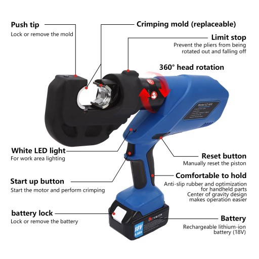 Łatwa obsługa: wystarczy wymienić odpowiednią matrycę do zaciskania, zainstalować baterię i nacisnąć przycisk start, aby rozpocząć zaciskanie kabli. Przycisk resetowania umożliwia ręczne zresetowanie tłoka.