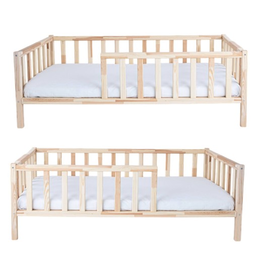 Przednia barierka łóżka jest uniwersalna, co umożliwia jej montaż zarówno po lewej, jak i prawej stronie.