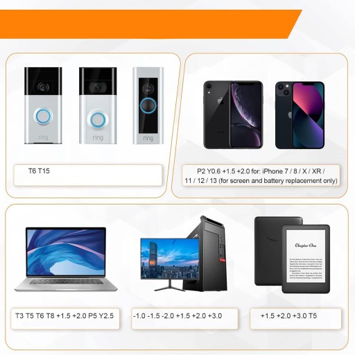 +1.5, 2.0 P2 Y0.6 MID2.5 pasują do iPhone’a 7, 8, X, XR, 11, 12, 13. +1.2, 1.5, 2.0, 3.0 T2, 3, 4, 5, P2 pasują do telefonów Samsung, Huawei, Xiaomi i nie tylko. +1.5, 2.0, 3.0 T3, 4, 5, 6, 9 pasują do iPada, Mini, Air, Pro. +1.2, 1.5, 2.0, 3.0 T2, 3, 4, 5 pasują do modeli Huawei, Honor i innych tabletów. P2, 5, 6 +1,5, 2,0, 3,0 T3, 4, 5, 6, 7, 8, 9 Y3.0 pasują do MacBooka Air, Pro. +1.5, 2.0, 3.0 T5 pasują do Kindle’a, Kindle’a Fire. T6, 15 pasują do dzwonków wideo Video Doorbell 2, Pro, Elite.