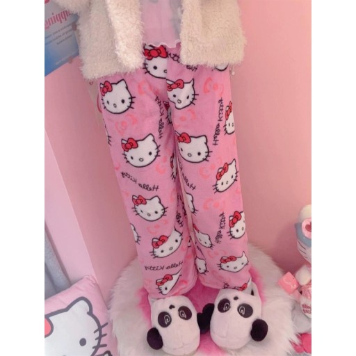 KOBIETA GRUBY CIEPŁY FLANELA SPODNIE OD PIŻAMY HELLO KITTY MIĘKKIE WYGODNE