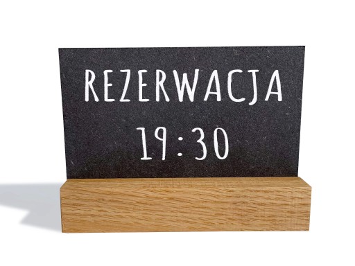 - Materiał: Tabliczka wykonana z MDF-u, barwiona na czarno; podstawka z naturalnego dębu.