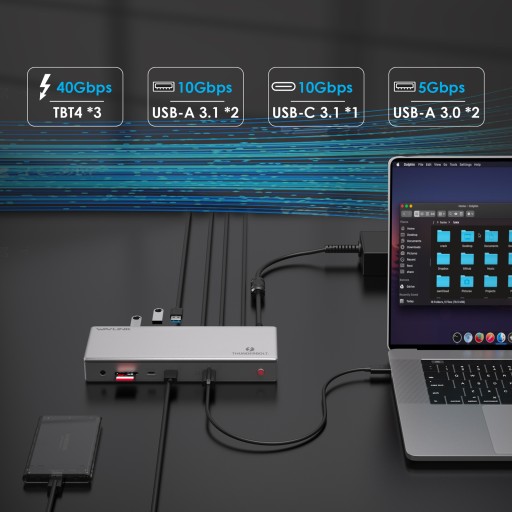 -Trzy porty TBT4 downstream przesyłają prędkość do 40 Gb/s i zapewniają ładowanie PD 15 W dla urządzeń USB, pojedynczy wyświetlacz 8K@30 Hz, podwójne wyświetlacze 4K@60 Hz.