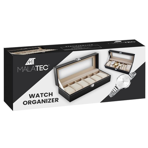 - SPECYFIKACJA - matertiał: pokrycie PU, konstrukcja – płyta MDF, szkło, pozostałe: nylon ,włóknina, flanela, PP, pianka, papier, karton, metalowe elementy; ilość przegródek: 6, kolor: czarny, wymiary: 30,5 x 11 cm, wymiary przegródki: 9,5 x 4,5 cm; waga: 0,525kg; waga w opakowaniu: 0,69kg.