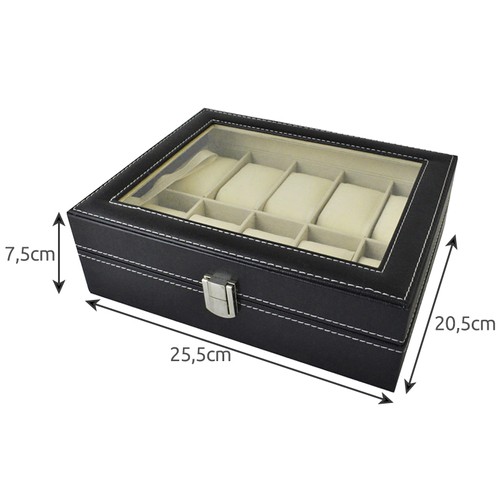 - SPECYFIKACJA - materiał: pokrycie PU, konstrukcja – płyta MDF, szkło, pozostałe: nylon ,włóknina, flanela, PP, pianka, papier, karton, metalowe elementy; ilość przegródek: 10, kolor: czarny, wymiary: 20,5x25,5x7,5cm; wymiary przegródki (dł. x szer.): 9 x 4,5 cm; waga: 0,724kg; waga w opakowaniu:1,3kg