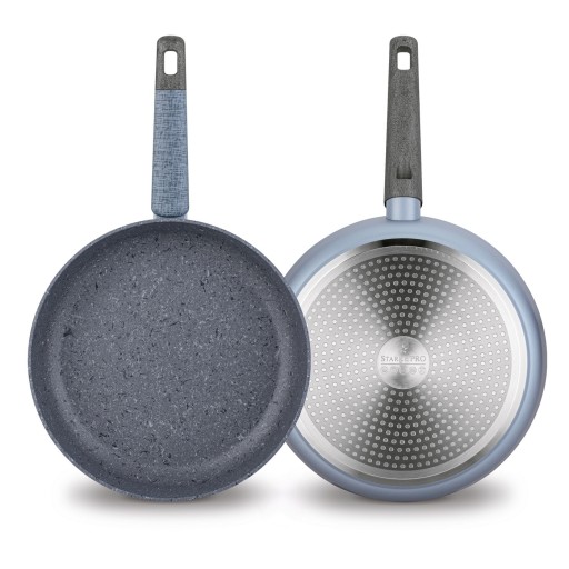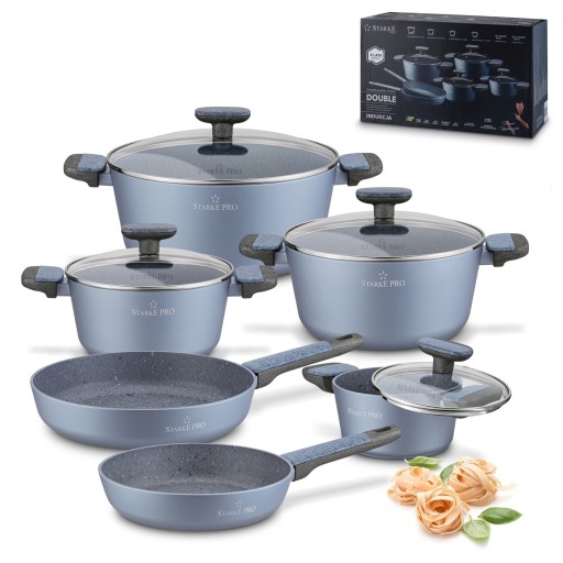 Nieprzywierający komplet garnków na indukcję z pokrywkami Starke Pro Double 10 elementów jest aluminiowy, ma grube ścianki i chroni jedzenie przed przywieraniem. Rodzaj korpusów, który wykorzystuje, wykuto na gorąco z pojedynczego arkusza metalu techniką forged. Dzięki temu 4 garnki i 2 patelnie – 24 i 28 cm – są bardzo solidne oraz dobrze przewodzą ciepło. Są też świetnie wyważone, co w połączeniu z nienagrzewającymi się i antypoślizgowymi uchwytami soft touch da ci wysoki poziom komfortu użytkowania. Zestaw działa na każdym typie kuchenki, ponieważ korzysta z dna indukcyjnego. Sprawia ono, że robienie posiłków jest szybsze, a przy tym energooszczędne. Trwałość powierzchni wewnętrznej naczyń z kolekcji Double opiera się na trzywarstwowej powłoce non-stick. Nie zawiera szkodliwych substancji (np. PFOA), jest twarda, charakteryzuje się doskonałą przyczepnością i naturalną fakturą oraz może znieść do 5000 cykli ścierania. Ułatwia też pielęgnację (nie do zmywarki, tylko mycie ręczne). W komplecie otrzymujesz również 4 szklane pokrywki dedykowane ze stalowymi rantami. Dzięki nim możesz dusić jedzenie i wygodnie regulować ilość pary wodnej wewnątrz garnków lub patelni. Seria Starke Pro Double z powłoką typu stone była testowana także przez zawodowego szefa kuchni, Piotra Kucharskiego. Poleca on ją do wieloletniego użytku w domowej kuchni. Komplet objęty jest 3-letnią gwarancją producenta – 5/6 gwiazdek w ogólnych testach jakości!
