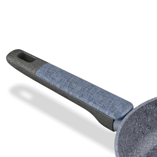 Pozostałe informacje: - zestaw wykonany z kutego aluminium, - pokryty powłoką non stick utwardzoną drobinkami granitu, - powłoka trzywarstwowa, - 5000 cykli ścierania, - grubość dna: 3,5 mm, - grubość ścianki: 2,8 mm, - grubość brzegu: 4,2 mm, - antypoślizgowe uchwyty soft touch, - PFOA free, - pokrywy szklane ze stalowym rantem i odpowietrznikiem