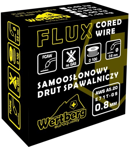 Szpula z gatunkowym drutem FLUX w precyzyjnym nawoju do spawania łukowego stali węglowych i niskostopowych półautomatem metodą FCAW - bez konieczności stosowania dodatkowego gazu osłonowego. Szybka, precyzyjna i efektywna praca z wykorzystaniem urządzeń zarówno profesjonalnych jak i amatorskich - warsztatowych dostępnych w sieciach handlowych.