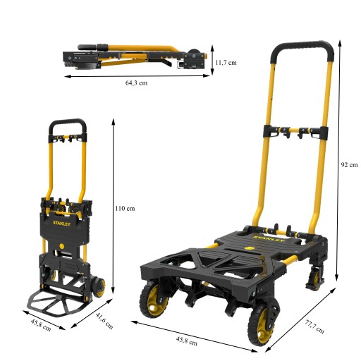 Stanley to powszechnie znana i ceniona marka, która gwarantuje stabilność i niezawodność w kwestii produktów. Dzięki praktycznej funkcji 2-w-1, dzięki której można używać wózka zarówno jako wózka platformowego, jak i ręcznego wózka widłowego, można go zawsze rozłożyć w zaledwie kilka sekund. Ponadto wózek wytrzymuje obciążenia do 120 kg. Przyda się każdemu do przewożenia zarówno małych, jak i trochę większych przedmiotów.