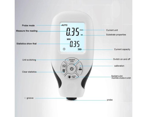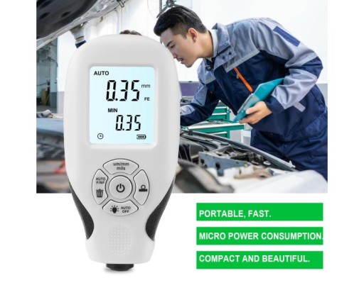 "Cechy:Duy ekran z podświetleniem, użytkownik może odczytać dwa pomiary w ciemnoci.Sonda o wysokiej czuoci: struktura sondy, dobra stabilno, pomiar jednego znaczenia.Zasilanie 2 bateriami 1,5 V AAA ( brak w zestawie), mikro pobr mocy.Zakres miernik tego miernika gruboci substancji wynosi od 0 do 2000um (78,7 milicala). Oznacza grubo powoki niemetalicznej, takiej jak farba, folia itp.Nadaje si do laboratoriw, warsztatw, lakierni, samochodw, przemysu itp.Specyfikacja:Stan: 100% nowyMateriał: ABSKolor: biayZakres pomiarowy: 0 ~ 2000umRozdzielczo: 0,01 mm/1 milDokadno pomiaru: +/-(3%+1UM)Minimalna grubo podoa: 0,5 mmZasilanie: 2 baterie AAA 1,5 V ( brak w zestawie)Rozmiar: 115*58*36mmWaga opakowania: 102gLista pakietów:1 * Tester gruboci produktów "