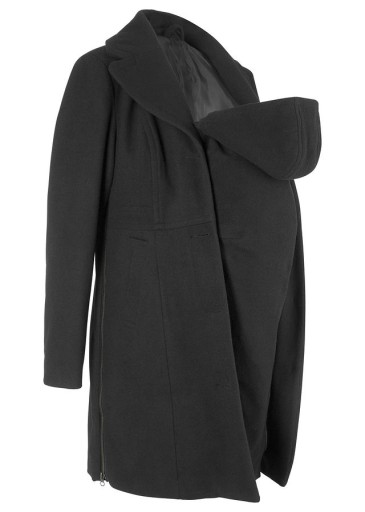 Płaszcz ciążowy, doskonały również po porodzie. Zamki po bokach pozwalające na zwiększenie obwodu. Wstawka niemowlęca służy wyłącznie ochronie dziecka przed zimnem, nie pełni funkcji nosidełka!