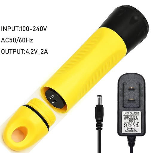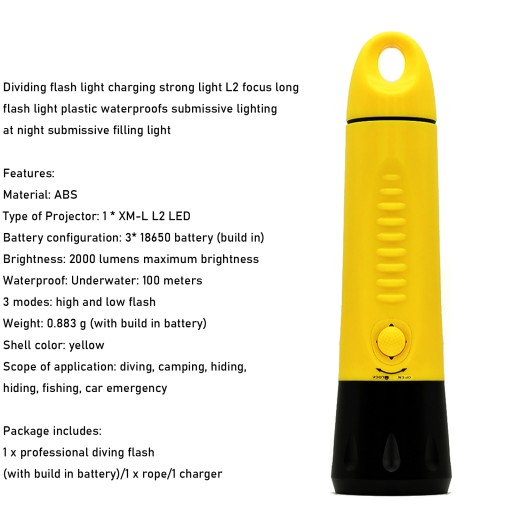 - opis Ładowarka mocna latarka nurkowa L2 Latarka długa plastikowa wodoodporne oświetlenie nurkowania Nocne Akumulatorowe światło nurkowe Cechy: Materiał: ABS. Typ projektora: 1 XM-L L2 LED Konfiguracja baterii: baterie 3x18650 (wbudowane) Jasność: Maksymalna 2000 lumenów Jasność Waga: 0.883G (z wbudowaną baterią) Kolor powłoki: żółty Zakres: nurkowanie, kemping, wędkarstwo, sytuacje awaryjne samochodowe Pakiet ten obejmuje: 1 profesjonalna latarka nurkowa (z wbudowaną baterią)/1 lina/1 ładowarka
