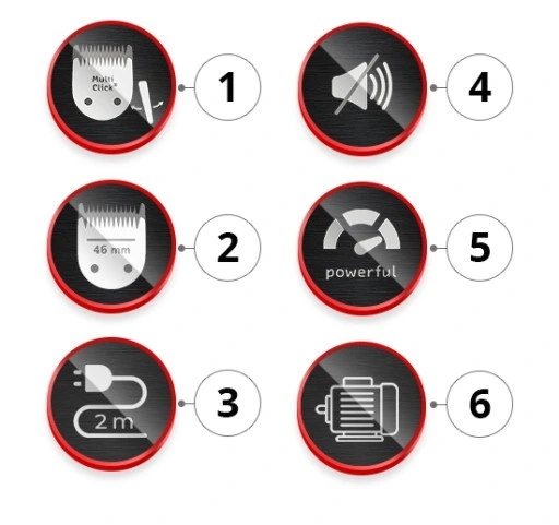 - 5 ustawień cięcia ostrza w zakresie od 0,7mm - 3mm 7 nasadek: 3 mm, 4.5 mm, 6 mm,9 mm,12 mm, 18 mm, 25 mm