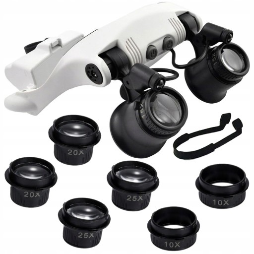 W zestawie znajduje się 8 sztuk wymiennych soczewek: 2szt 25X, 2szt 20X, 2szt 15X, 2szt 10X i silikonowy pasek do okularów.