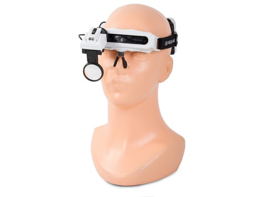 Diody LED można regulować kąt pochylenia w zależności od potrzeb. Cały mechanizm jest oparty w formie wygodnej gumowej opaski na głowę. W miejscu styczności z czołem, lupa wyściełana jest bardzo miękkim, delikatnym dla skóry materiałem.
