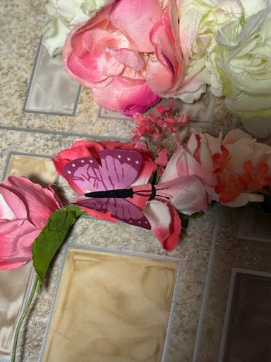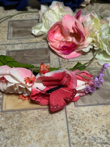 1.ŚLICZNY EFEKTOWNY WIANEK Z MOTYLKAMI MA SZTYWNYM DRUCIKU - DO RENOWACJI , WYMAGA O OWINIĘCIA DRUCIKA TASIEMKĄ I ODŚWIEŻENIA - KWIATKI KOMPLETNE