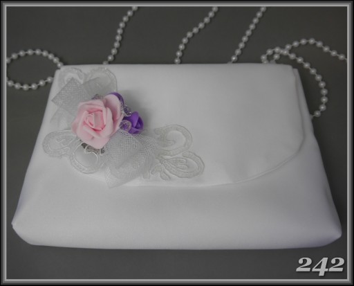 Komplet komunijny satynowa w kształcie woreczka z usztywnianą wkładką pomagającą w zachowaniu kształtu nawet po obciążeniu, ozdobiona koronkową aplikacją z kolorową przypinką, rękawiczki, okapnik na świecę satynowy Do kompletu można dopasować wianek dostępny na naszych pozostałych aukcjach. Cena nie zawiera świecy !!! Dla miłośniczek torebek prostokątnych przygotowaliśmy taką torebkę dostępną na naszych pozostałych aukcjach.
