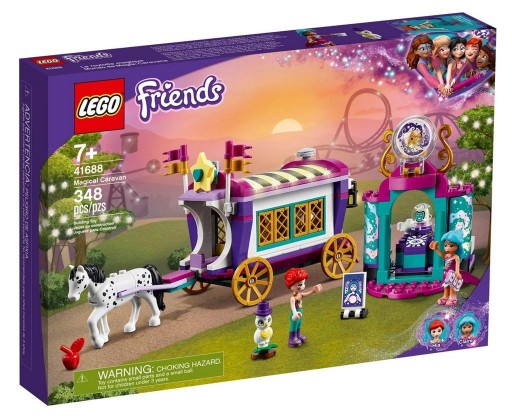 o Zestaw Magiczny wóz (41688) z modelem staromodnego wozu i namiotem wróżki kryje w sobie sekrety, które dostarczą dzieciom pomysły na fascynującą zabawę i wcielanie się w role.o W komplecie są dwie minilaleczki LEGO(R) Friends oraz figurki konia i sowy, a to oznacza mnóstwo możliwości kreatywnej zabawy. Przytulny wóz też jest bardzo ciekawy -- dzieci znajdą w nim piec, stolik i ukrytą toaletę.o Dzieci mogą bawić się w opiekę nad koniem, rozmawiać z mądrą sową, czytać przyszłość w kryształowej kuli, a nawet jeździć zabawkowym wozem -- granicą jest wyobraźnia.o W zestawie jest osobny namiot wróżki, więc dzieci mogą urządzić pokaz wróżb dla rodziny lub zabrać kryształową kulę do przyjaciół. Dzięki temu zabawa będzie jeszcze ciekawsza!o Ten zestaw pęka w szwach od magii i będzie wspaniałym prezentem na święta, urodziny lub bez okazji dla każdego kreatywnego chłopca lub dziewczynki w wieku od 6 lat.o Wóz ma ok. 11 cm wysokości i 24 cm długości, a namiot ma ok. 11 cm wysokości i 8 cm szerokości, co oznacza, że modele można spokojnie zmieścić nawet na niewielkiej półce.o Wóz ma mnóstwo inspirujących detali i otwierany dach, który pozwala dzieciom bawić się w środku i udawać gotowanie na piecyku lub nalewanie wody do wiadra, żeby napoić konia.